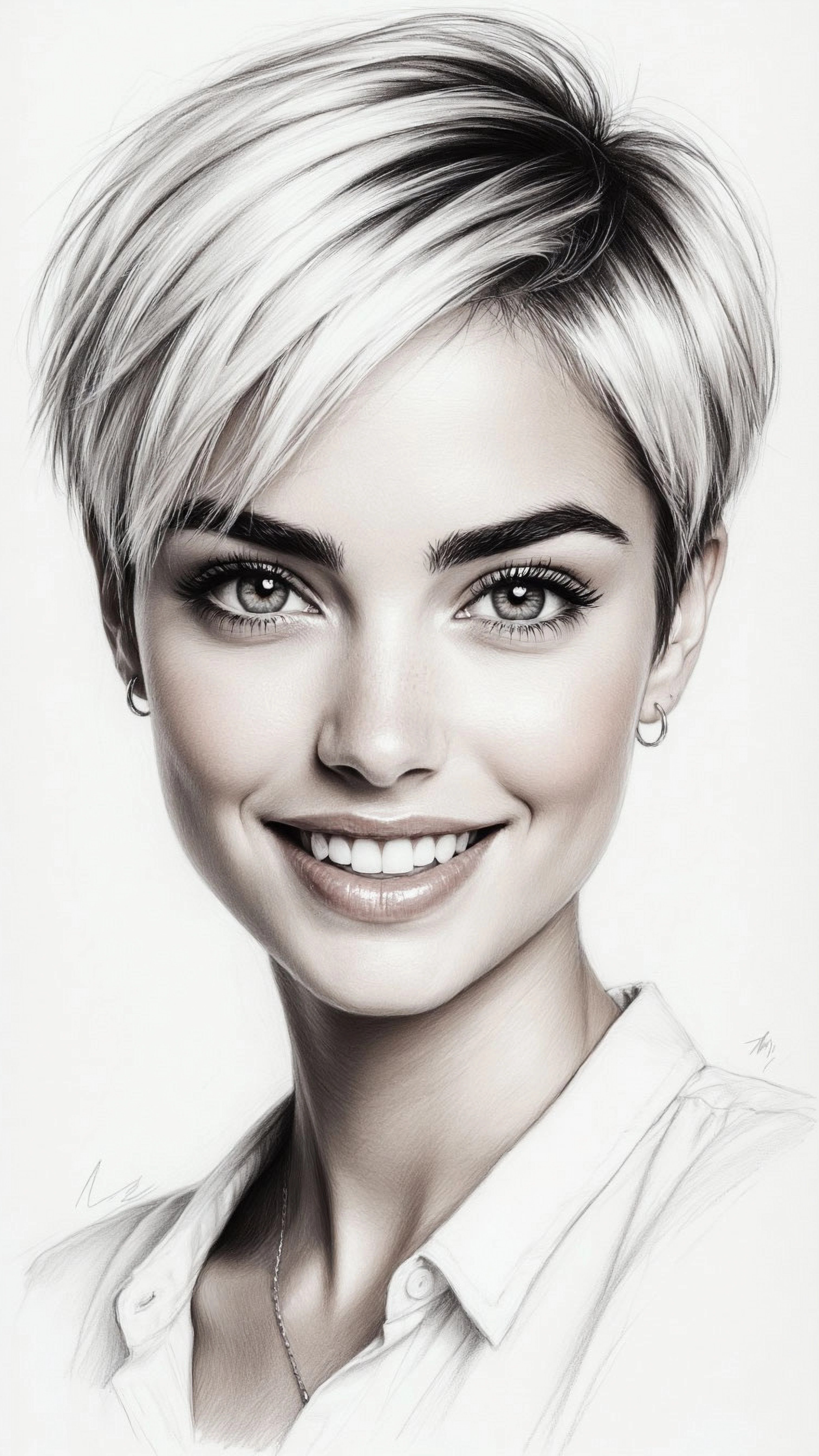 Идеальная женщина, модель, выразительные глаза, высокая детализация глаз и лица, длинные ресницы, озорная улыбка, глянец, стильная, шикарная, в тренде, чувственная, изящная, яркая, женственная, фотогеничная, красотка, миловидная очаровательная, бигуди, очень-очень короткая ассиметричная стрижка, ближний восток, бежевый, белый, кофейный, рисунок карандашом