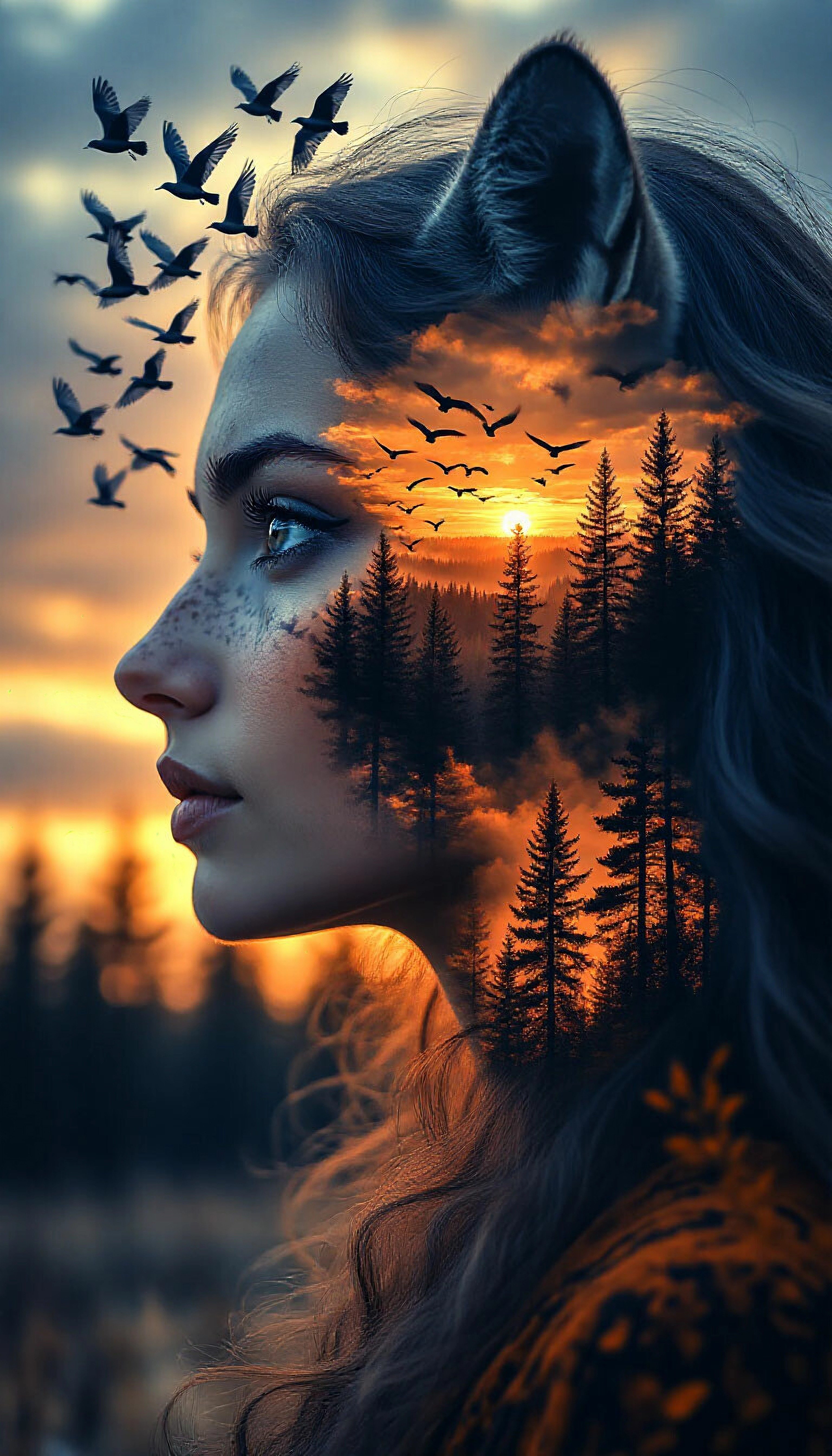 Портрет ведьмы, выполненный в технике двойной экспозиции, совмещающей образ животного с пейзажами разных времен года. В левой верхней части кадра парит стая птиц. Верхняя часть лица, включая лоб и уши, имеет серо-голубой оттенок шерсти. Ниже, на скулах и под глазами, цвет переходит в золотисто-коричневый, имитирующий закатное освещение. В этой области внутри контура просматривается пейзаж с сосновым лесом и силуэтами деревьев на фоне закатного неба.