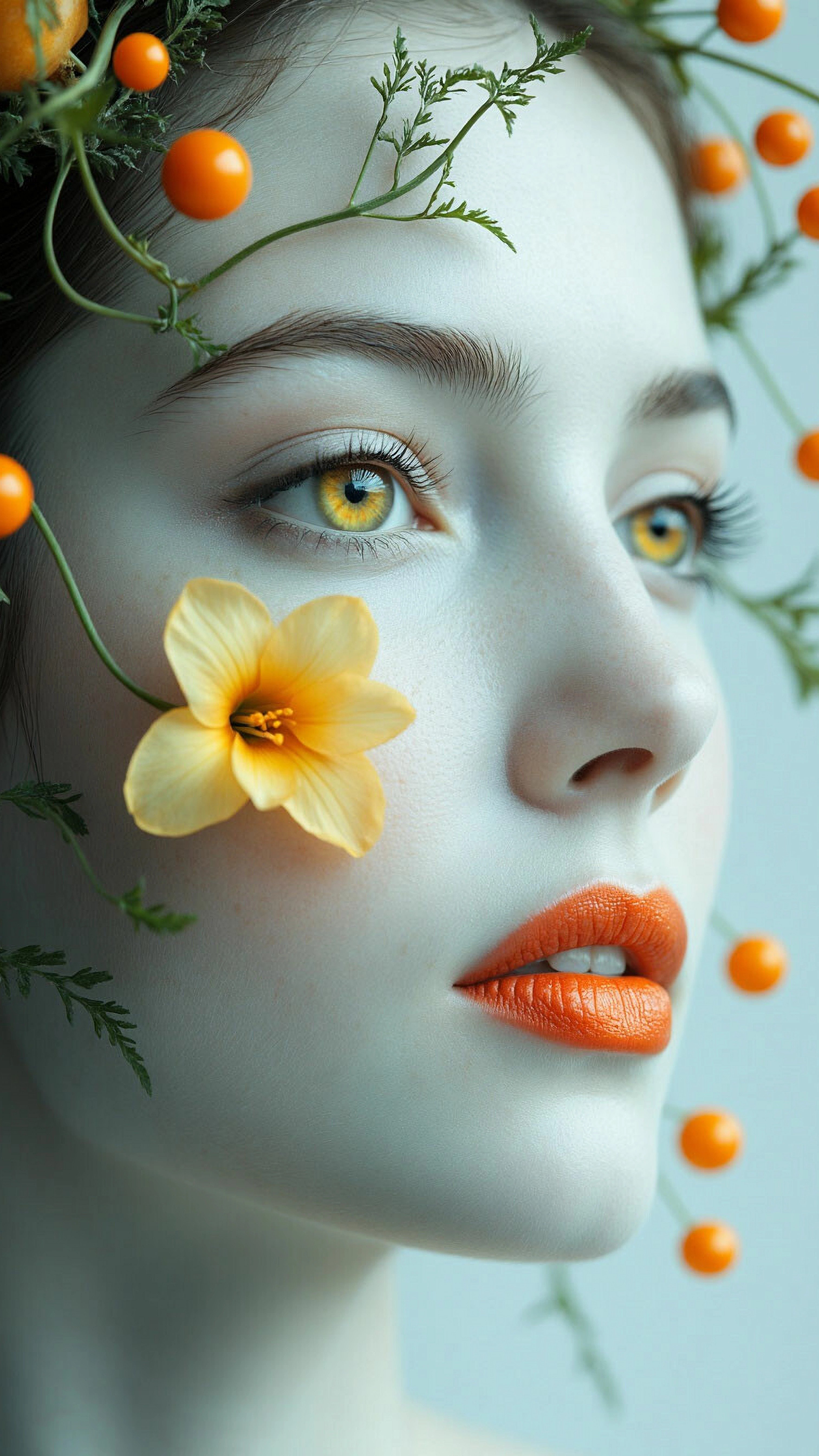 Часть лица женщины. Кожа лица имеет бледный голубоватый оттенок. Виден один глаз, с радужкой желтого цвета. Губы полные, покрыты блестящей помадой кораллового цвета. Лицо обрамлено стилизованными растительными элементами. Использованы стебли с тонкими ветвями, зеленые цветы с плотными соцветиями и листья с текстурированной поверхностью. Некоторые из стеблей украшены маленькими оранжевыми шариками. Расположены вдоль контура лица, как бы обрамляя его. Фон изображения имеет светлый, размытый