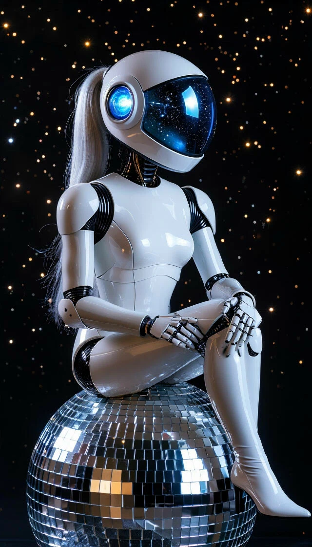 Женщина бот, сидит на зеркальном шаре-дискотеке, голова в шлеме с голубым забралом в котором отображается космос, из под шлема белый хвост женских волос. Фон чёрный, звёздное небо, звёзды, вселенная