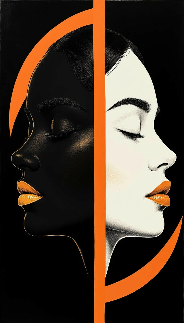 Метки: девушка, красиво, разныеСтилизованная иллюстрация, изображающая два женских профиля, расположенных бок о бок. Один профиль имеет тёмную, почти чёрную кожу, а другой — светлую, почти белую. Оба профиля обращены вправо и имеют закрытые глаза, что создаёт ощущение покоя или созерцания. У обоих профилей губы выделены золотистым оттенком.