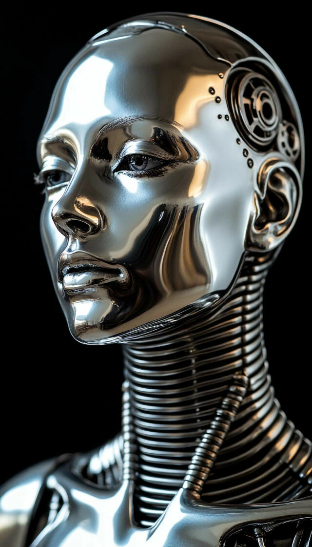 Крупный план металлической фигуры девушки, кибернетический бюст. Вся фигура выполнена в серебристых тонах с глянцевой поверхностью, отражающей свет.