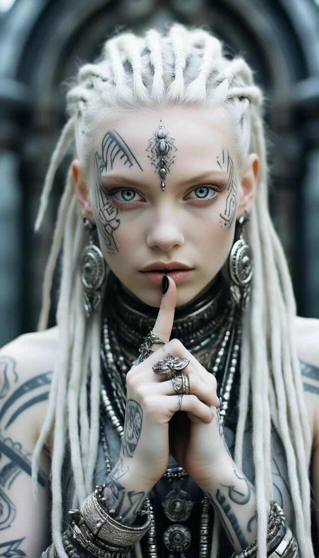 Женщина альбинос с серыми глазами. Длинные белые дреды, тату на лице. На лице и теле серьги и кольца. Жест «тишина». Фантастика футуризм. Кожа покрыта белой пудрой, очаровательная, яркий агрессивный макияж, стальные шипы. Трон