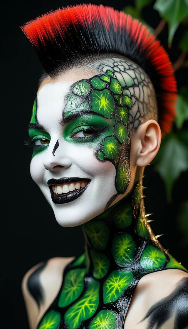 Сюрреализм, глубина цвета, высокое разрешение и качество, искажение, фото, улыбка, капля + шипы, женщина, профессиональный агрессивный макияж, белый, бодиарт, ирокез, чёрный опал, смешение цветов масляной серой краски, абстракция, в маске, в тренде, сеть, зелёные неоновые грибы и плющ, чёрный фон + неон матрица
