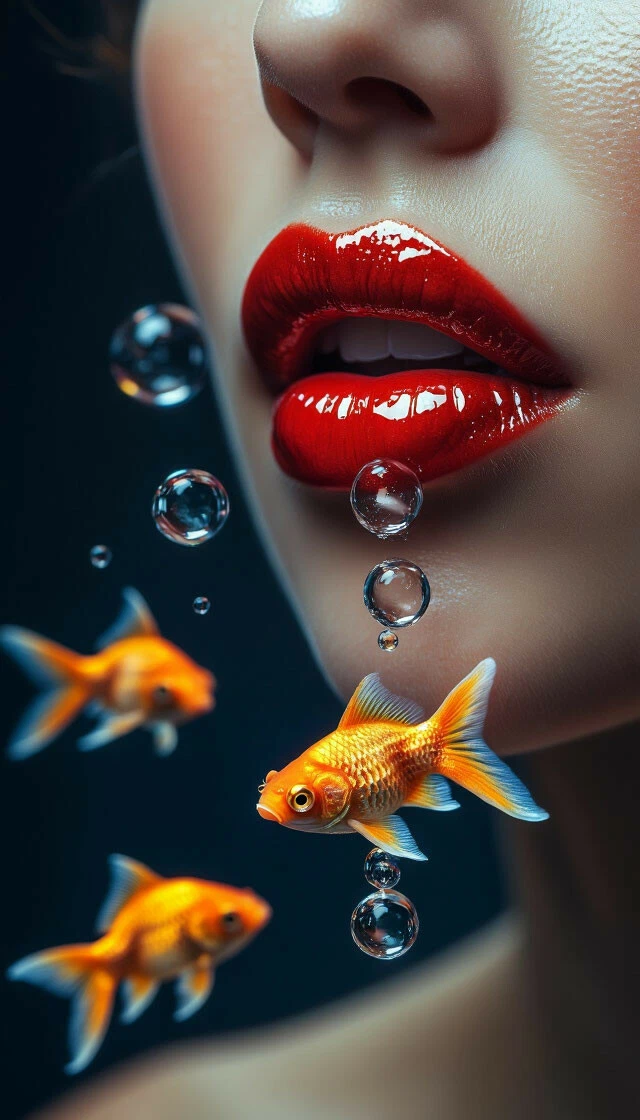 The image shows a face in dark blue tones. A part of the nose and bright red lips are visible, which are glossy and shiny. A transparent drop resembling water extends from the lips. Inside this drop, two goldfish swim, with air bubbles and small splashes of water visible around them. Another goldfish is visible in the background, to the left of the drop, in a blurred state. The background is dark.