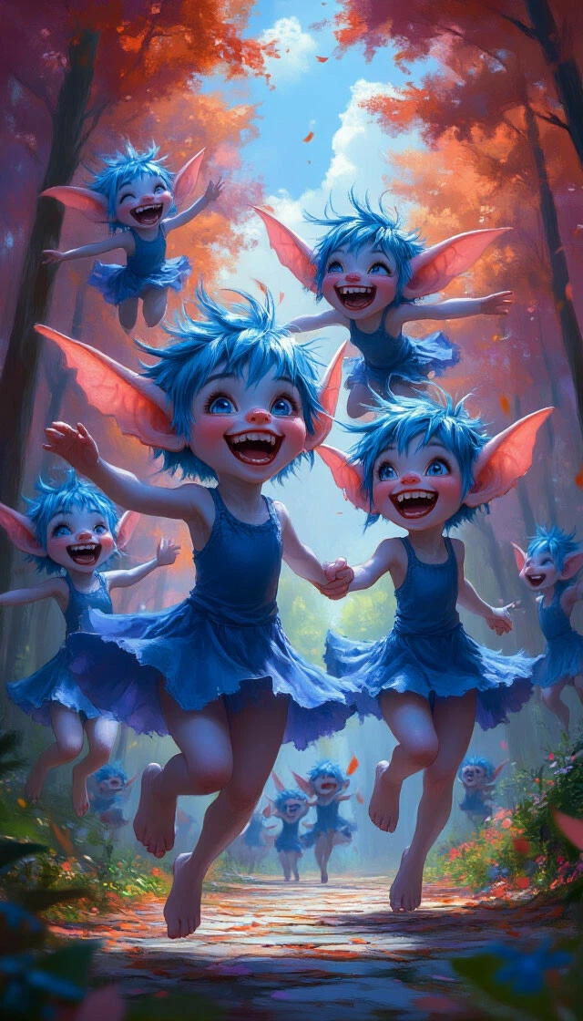 Цифровое искусство, изображающее большую группу летающих маленьких, сказочных существ. У них синяя кожа, заостренные уши с розовым оттенком и взъерошенные синие волосы, окруженные мерцающими искрами. У существ широко раскрытые рты, улыбки, видны зубы, и они кажутся очень счастливыми, издавая смех.