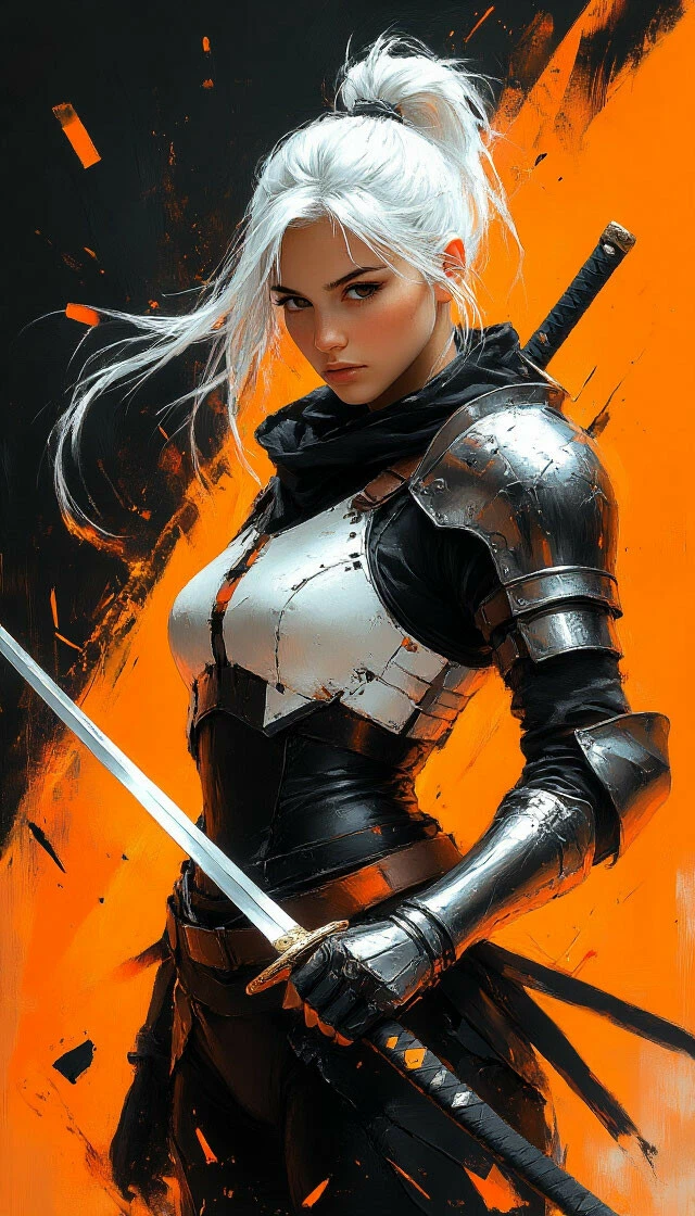 Женщина в динамичной позе, белые волосы в хвост, чёрно–оранжевый фон, латы, меч, худи, светотень, забрало зеркального шлема, осколки стекла