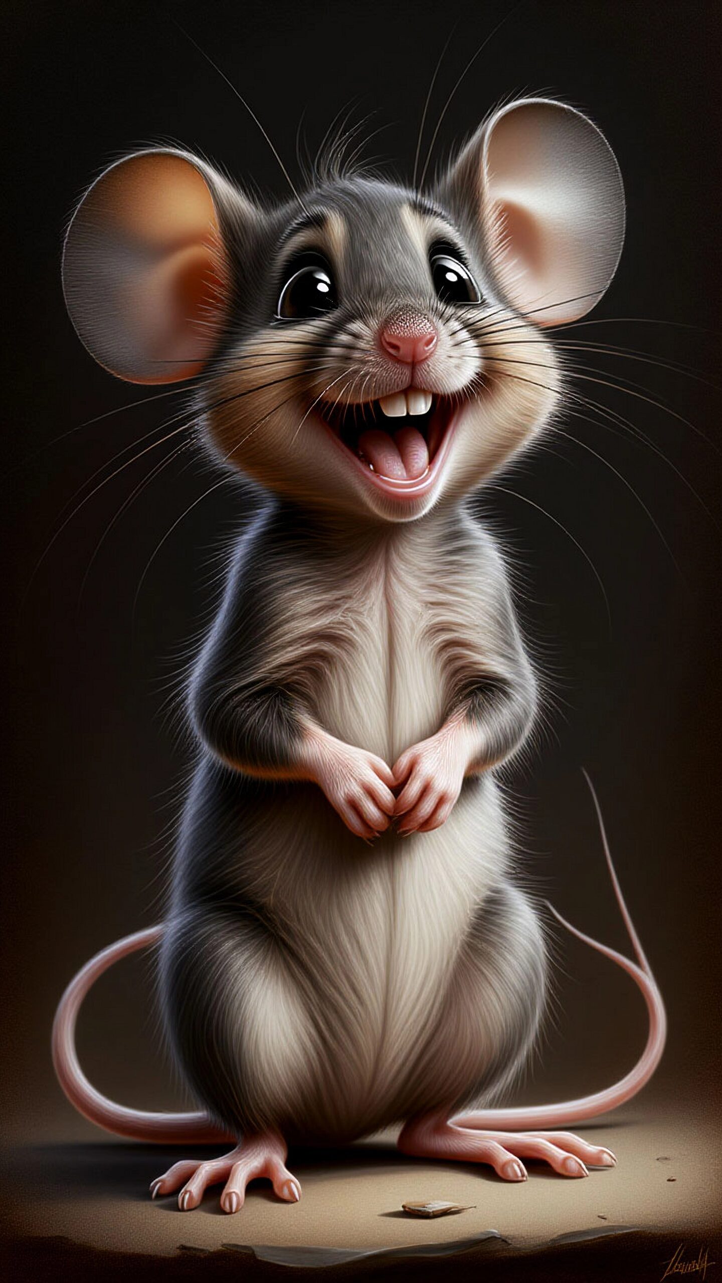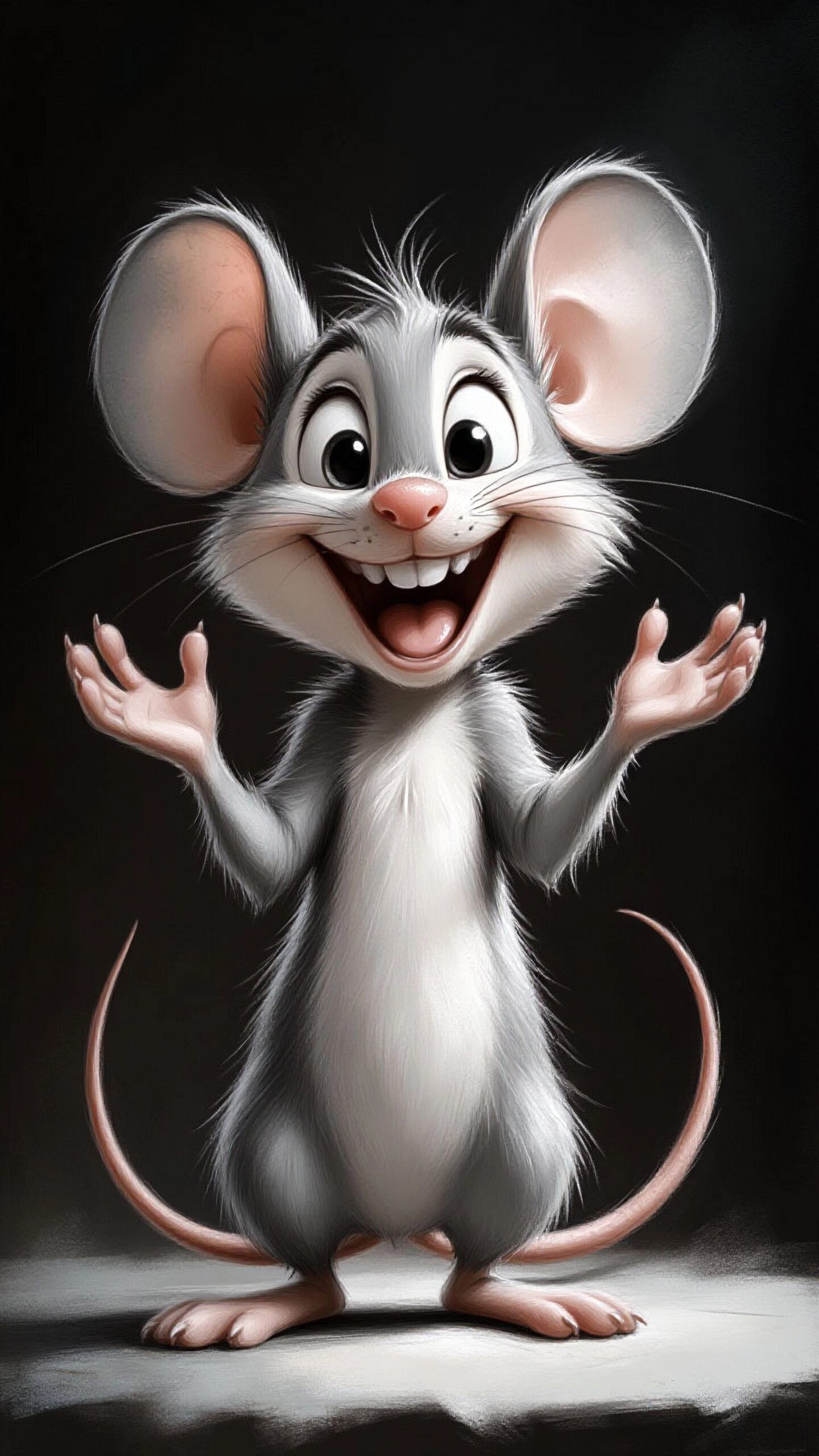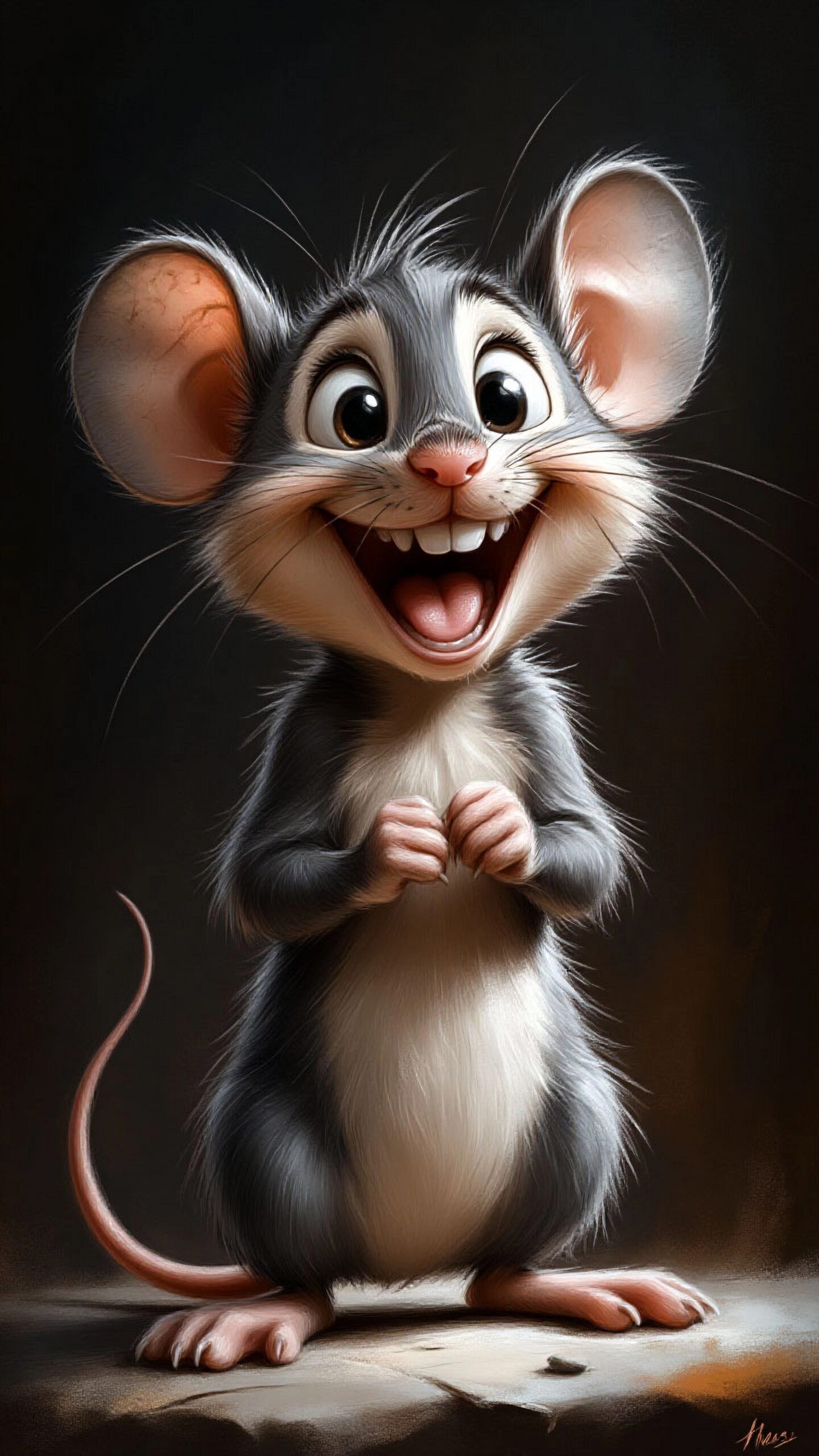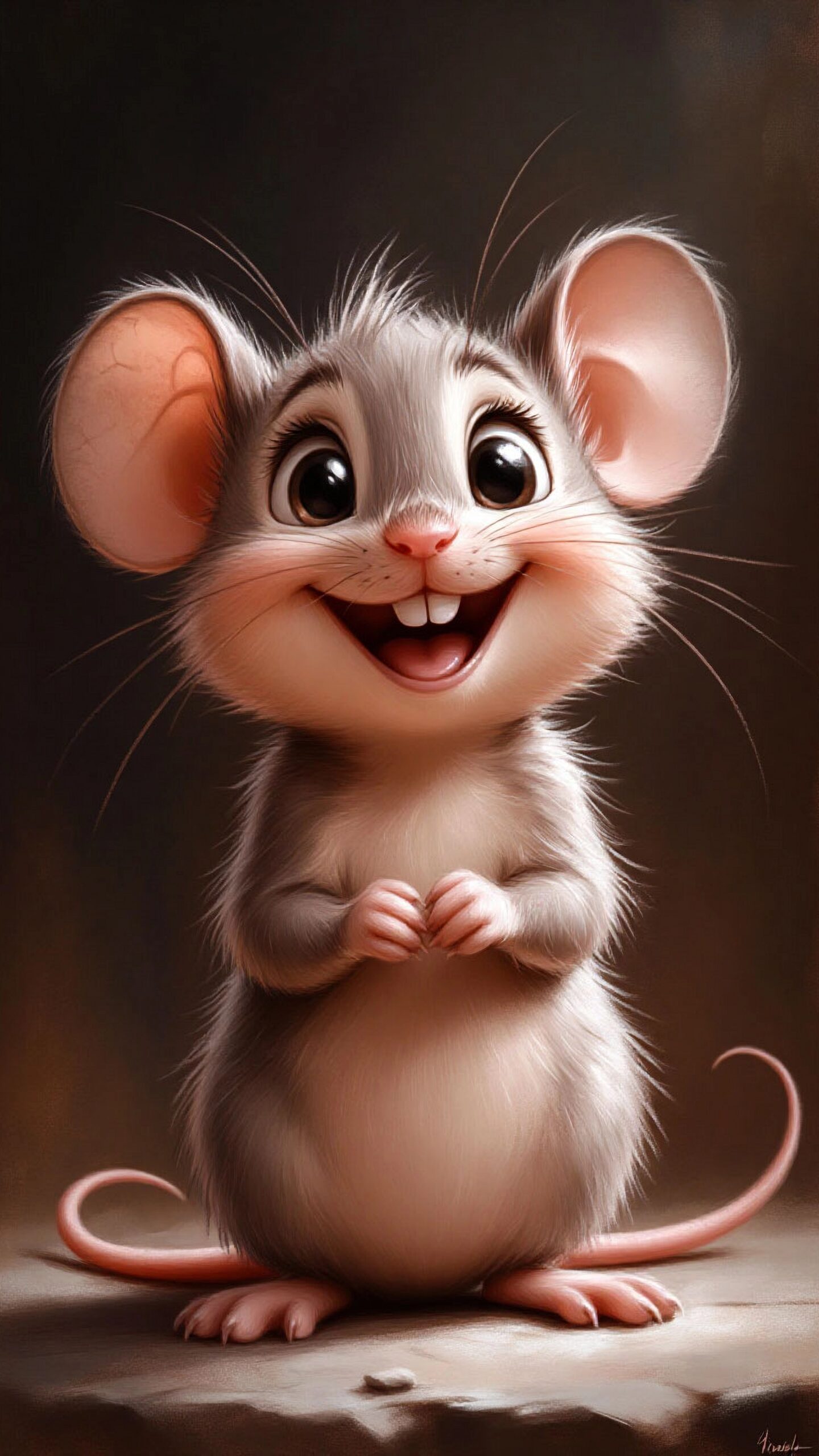 На изображении представлен улыбающийся мышонок, что вызывает ассоциации с позитивными эмоциями и детским восприятием мира. Визуальная репрезентация этого персонажа может быть интерпретирована как символ невинности и радости, присущей юным существам. Улыбка мышонка, вероятно, выполнена с использованием различных художественных техник, таких как акварели, пастель или цифровая живопись, что позволяет передать нюансы мимики и создать эффект естественности.