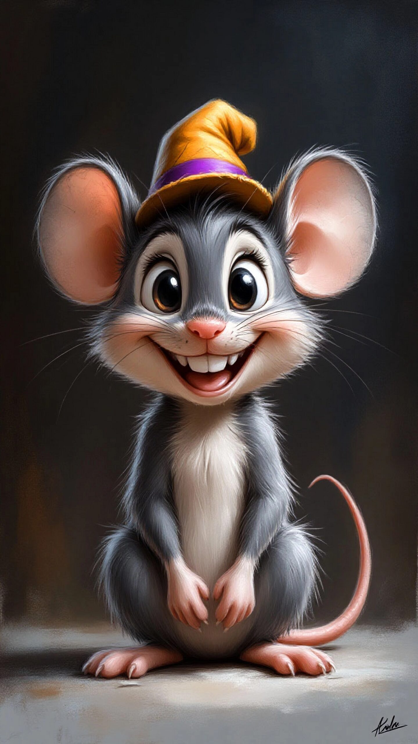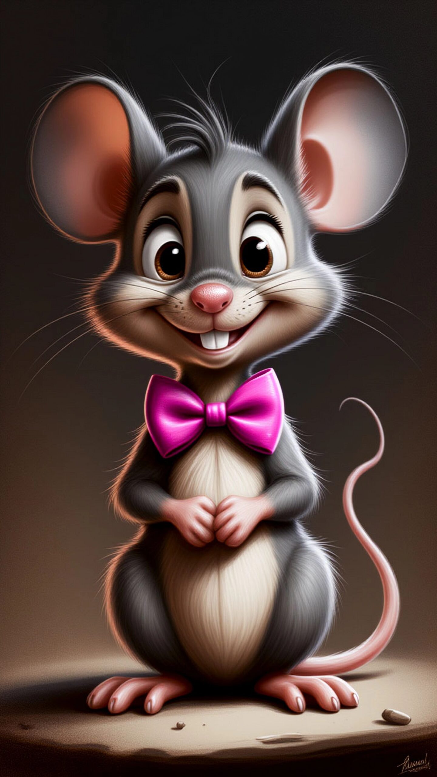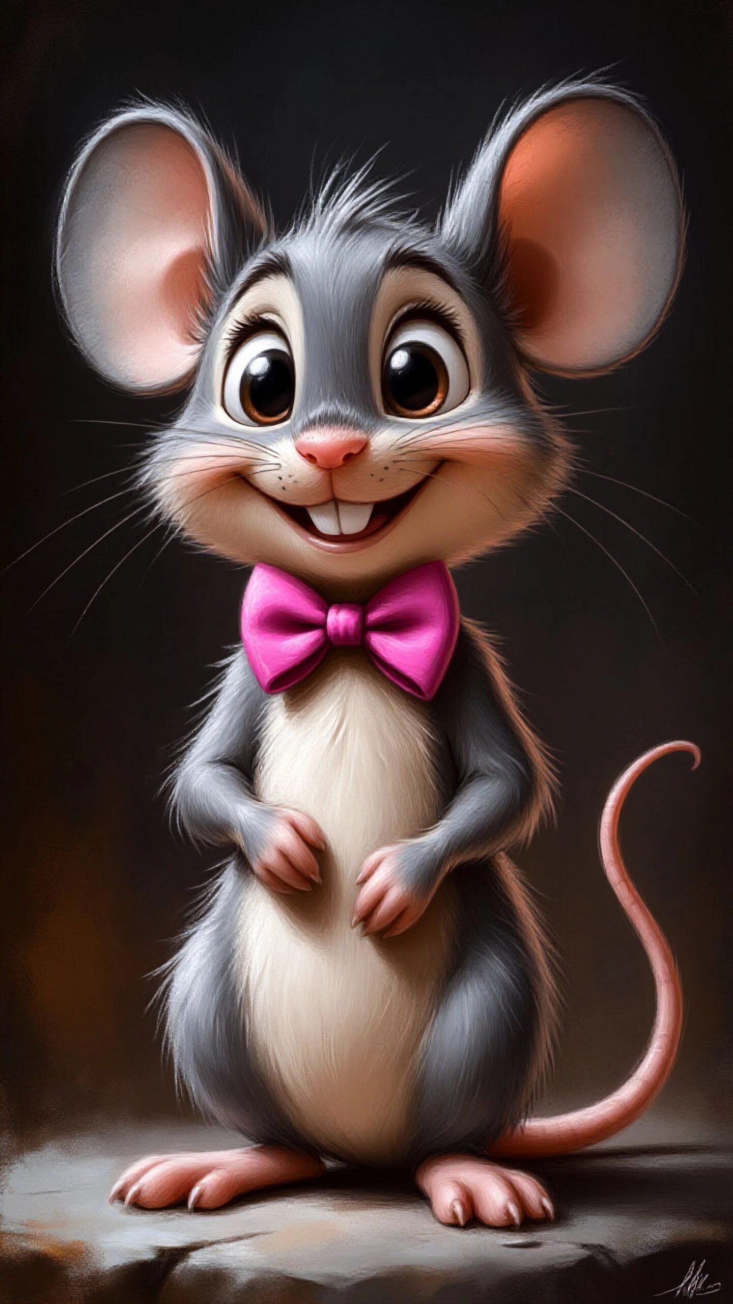 На изображении представлен улыбающийся мышонок, что вызывает ассоциации с позитивными эмоциями и детским восприятием мира. Визуальная репрезентация этого персонажа может быть интерпретирована как символ невинности и радости, присущей юным существам. Улыбка мышонка, вероятно, выполнена с использованием различных художественных техник, таких как акварели, пастель или цифровая живопись, что позволяет передать нюансы мимики и создать эффект естественности.