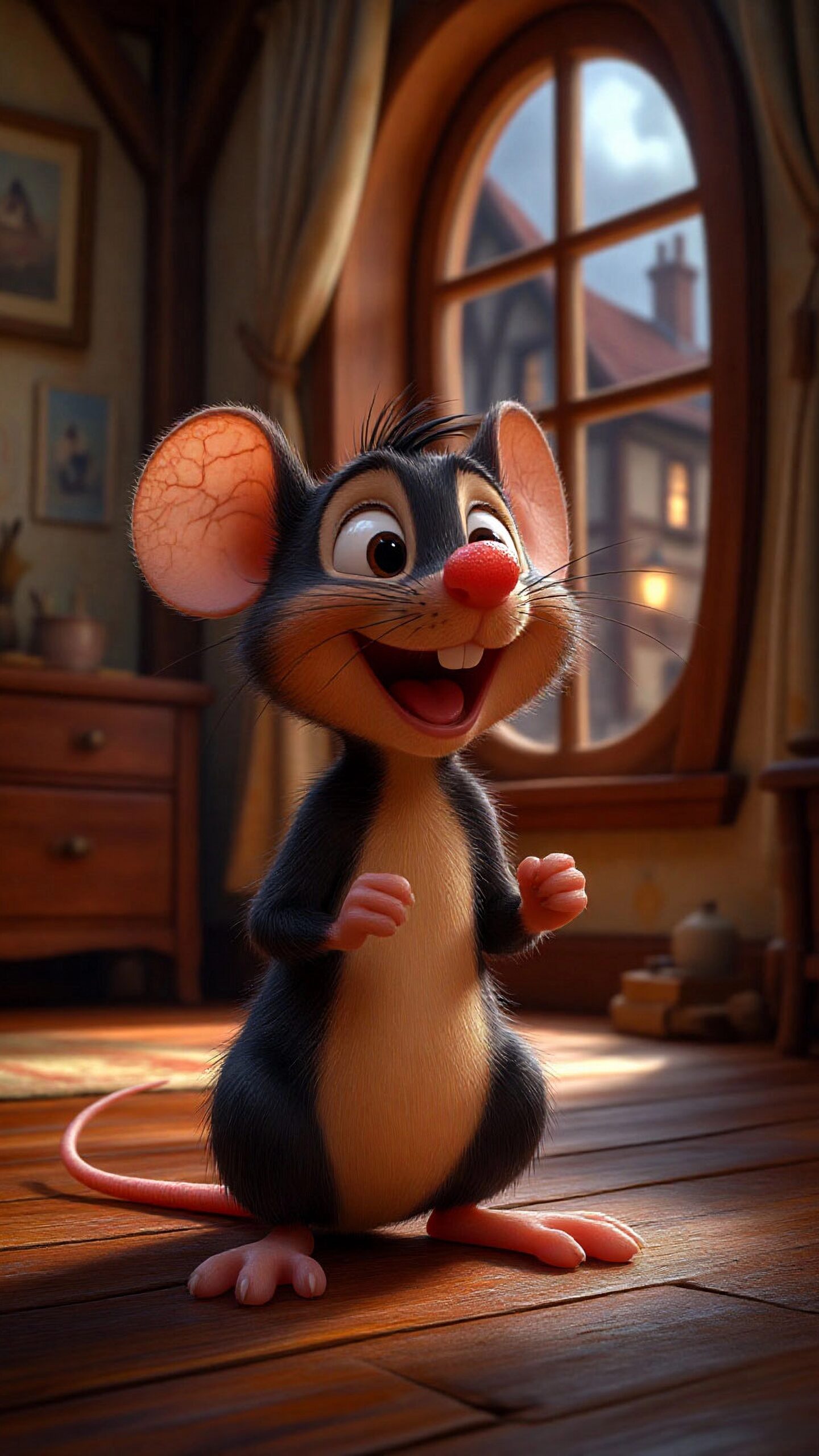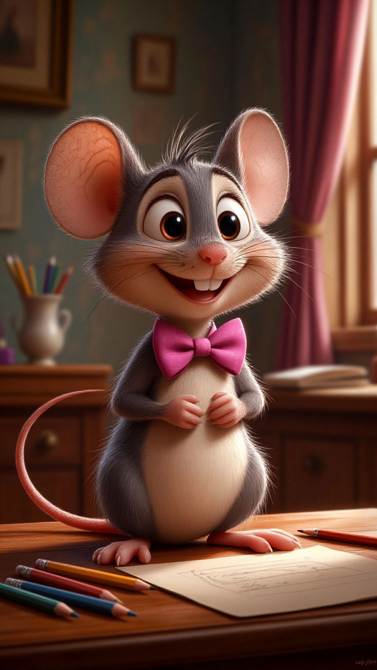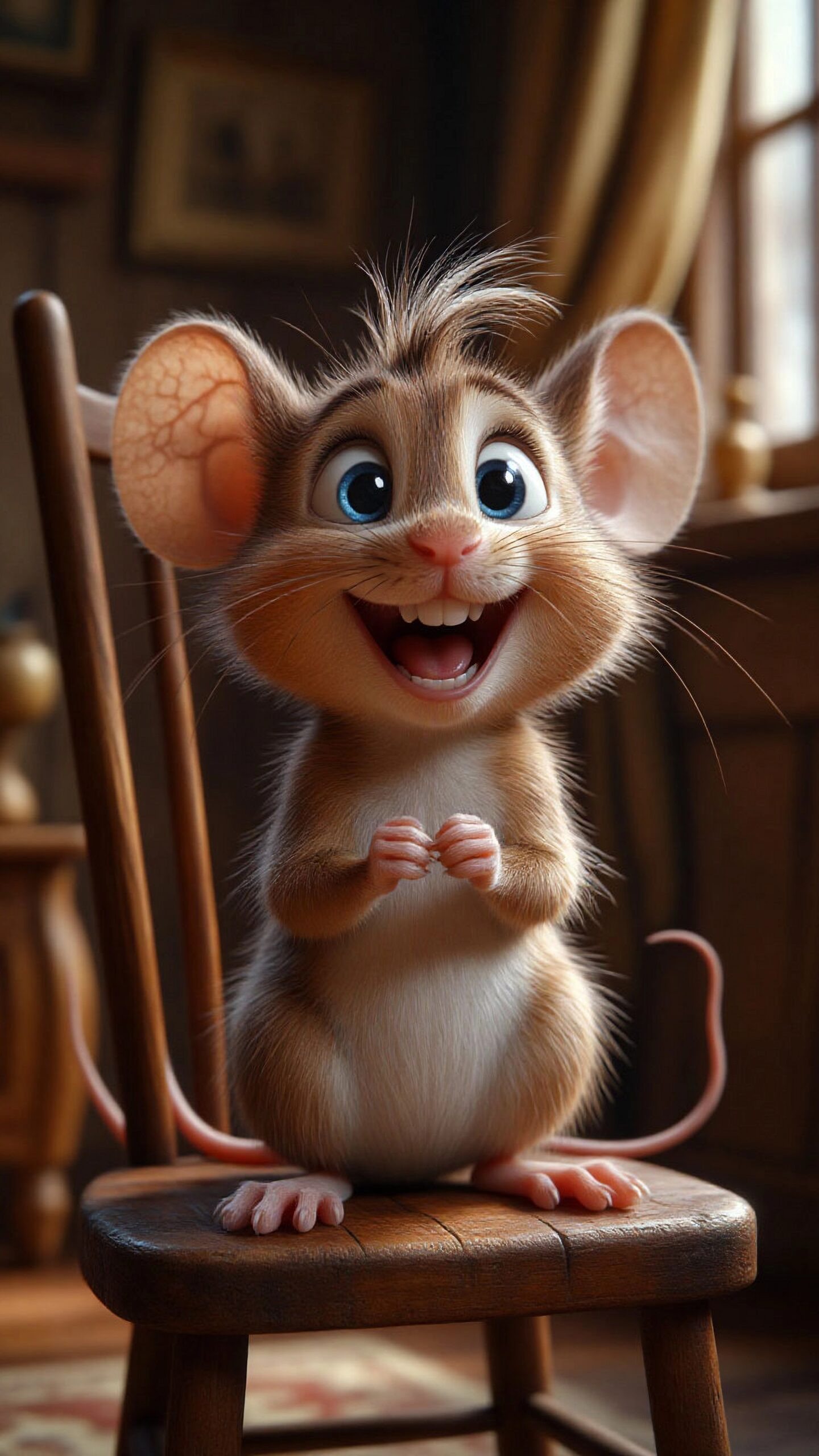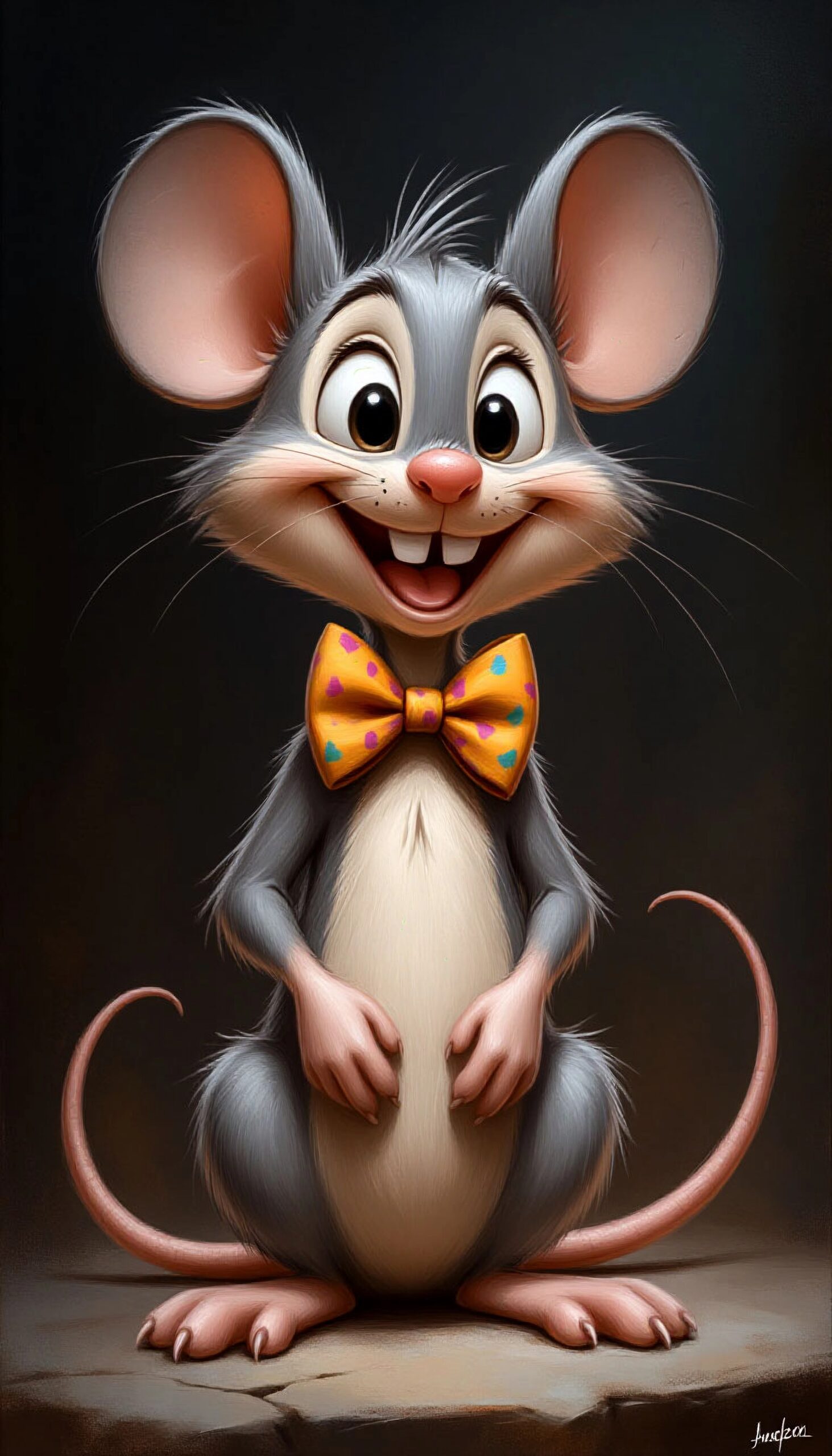 На изображении представлен улыбающийся мышонок, что вызывает ассоциации с позитивными эмоциями и детским восприятием мира. Визуальная репрезентация этого персонажа может быть интерпретирована как символ невинности и радости, присущей юным существам. Улыбка мышонка, вероятно, выполнена с использованием различных художественных техник, таких как акварели, пастель или цифровая живопись, что позволяет передать нюансы мимики и создать эффект естественности.