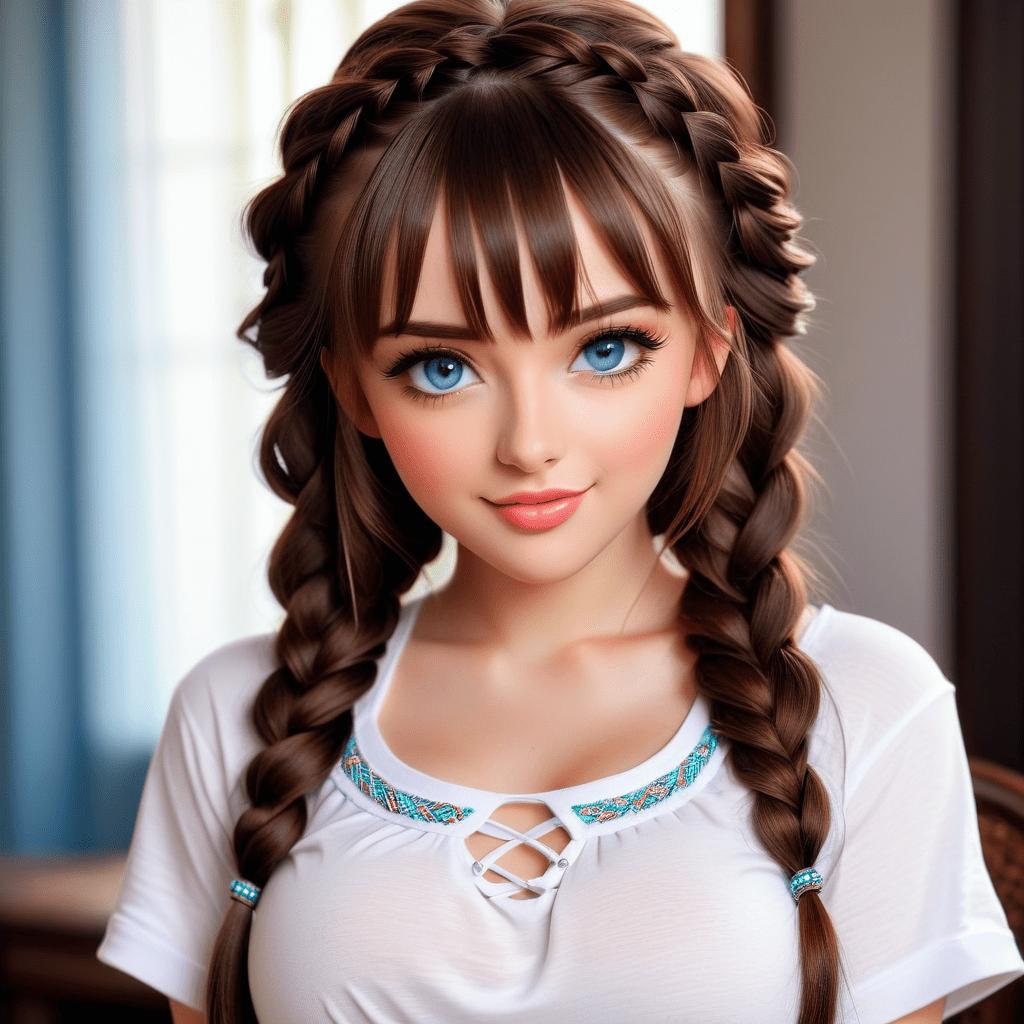 Beautiful girl, bangs, blue eyes, brunette, hair braided in a reverse braid, charming sweet smile, big expressive eyes, big bust to look into the eyes, very beautifully shaped plump lips, scrupulous, jewelry, gloss, large eyelashes, white T-shirt, bangs