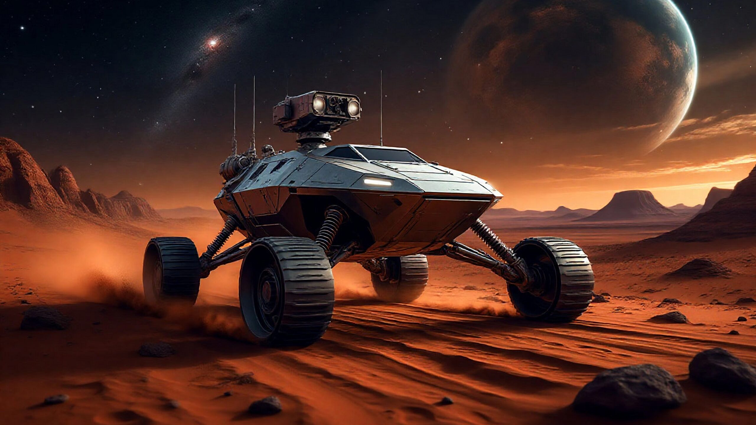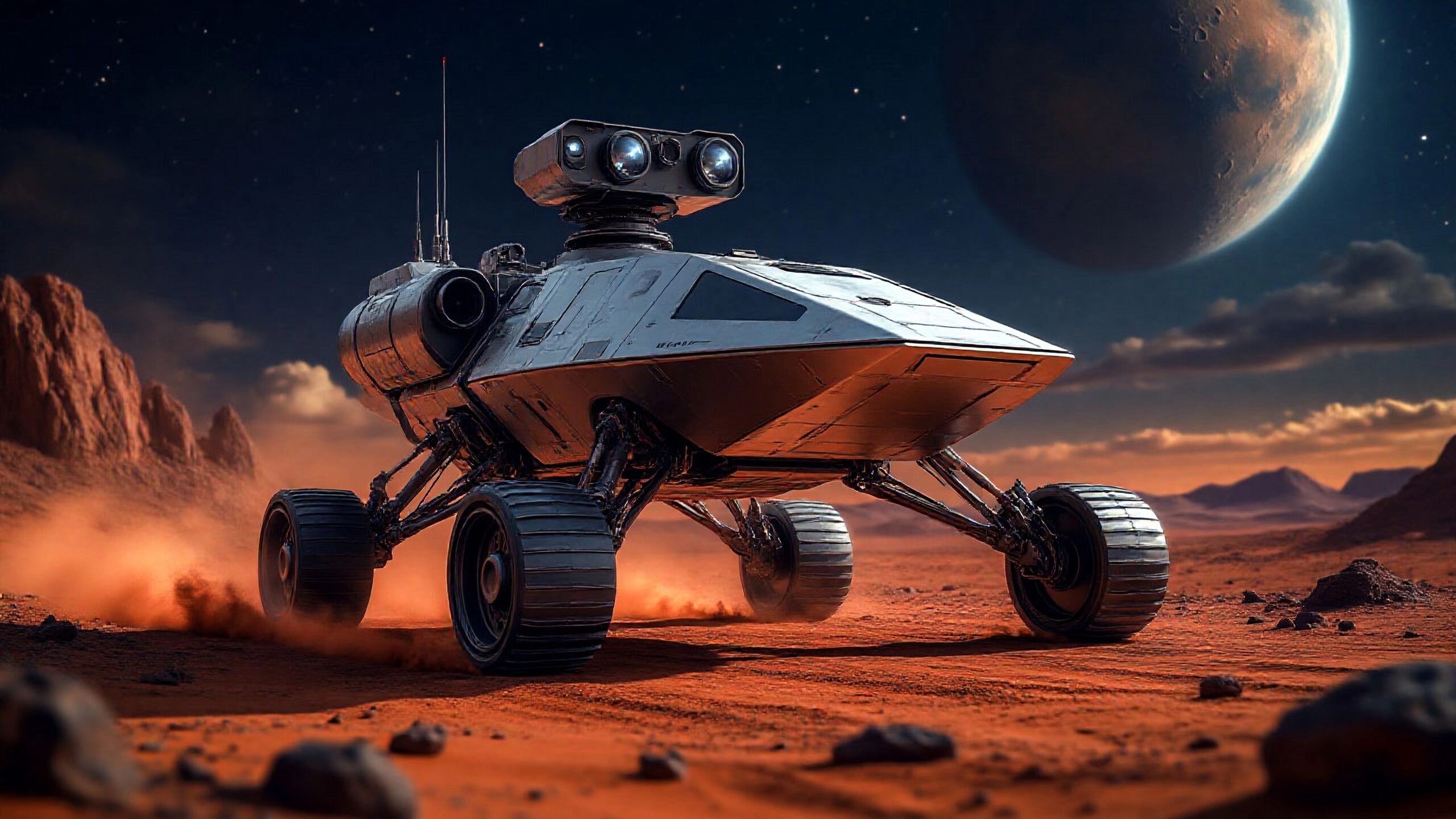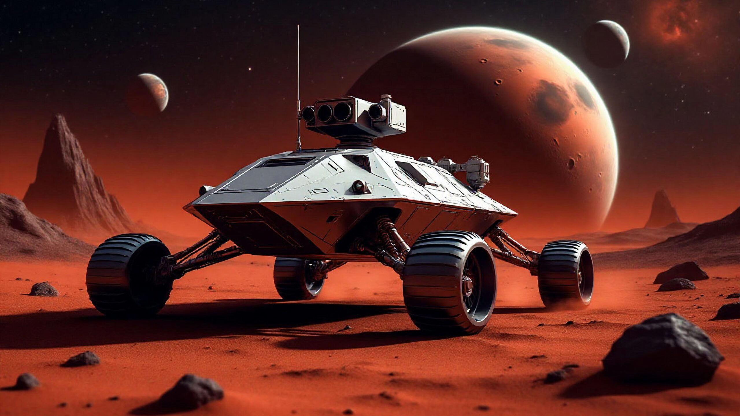 Реалистичная картинка Марса, футуристический марсоход. Обои на компьютер 4096х4096