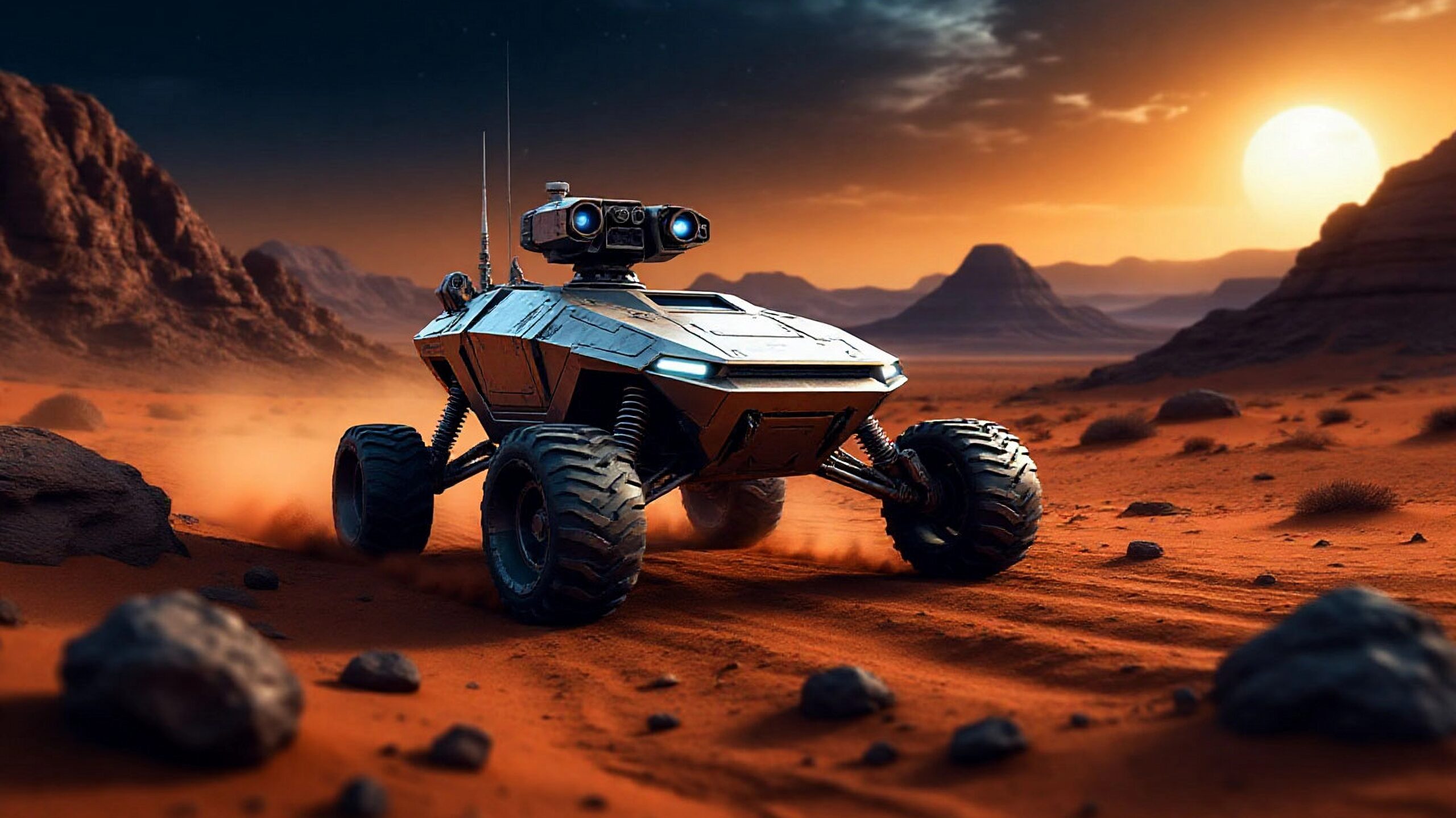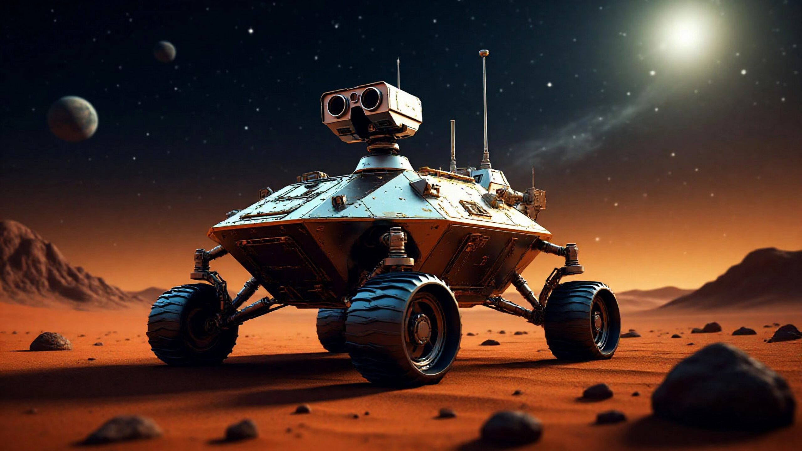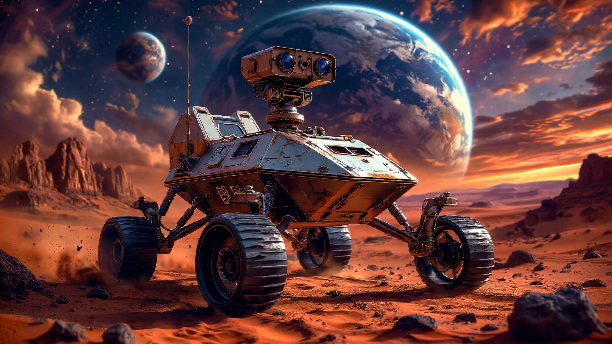 Реалистичная картинка Марса, футуристический марсоход. Обои на компьютер 4096х4096